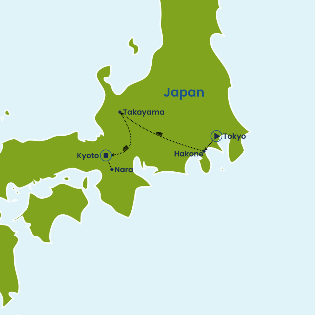 Experience the perfect blend of tradition and modernity on this 10-day Japan journey. Begin in Tokyo, where ancient temples and lively streets set the stage for cultural discovery, including a sumo show lunch and visits to Senso-ji and Meiji Jingu. Take in stunning views of Mt Fuji and Lake Ashi as you unwind in the hot springs of Hakone. In Takayama, explore charming old towns, sake breweries, and morning markets. Then, immerse yourself in Kyoto’s rich heritage—from the bamboo groves of Arashiyama and golden temples to the sacred shrines of Nara and the elegance of a Geisha dinner in Gion.
