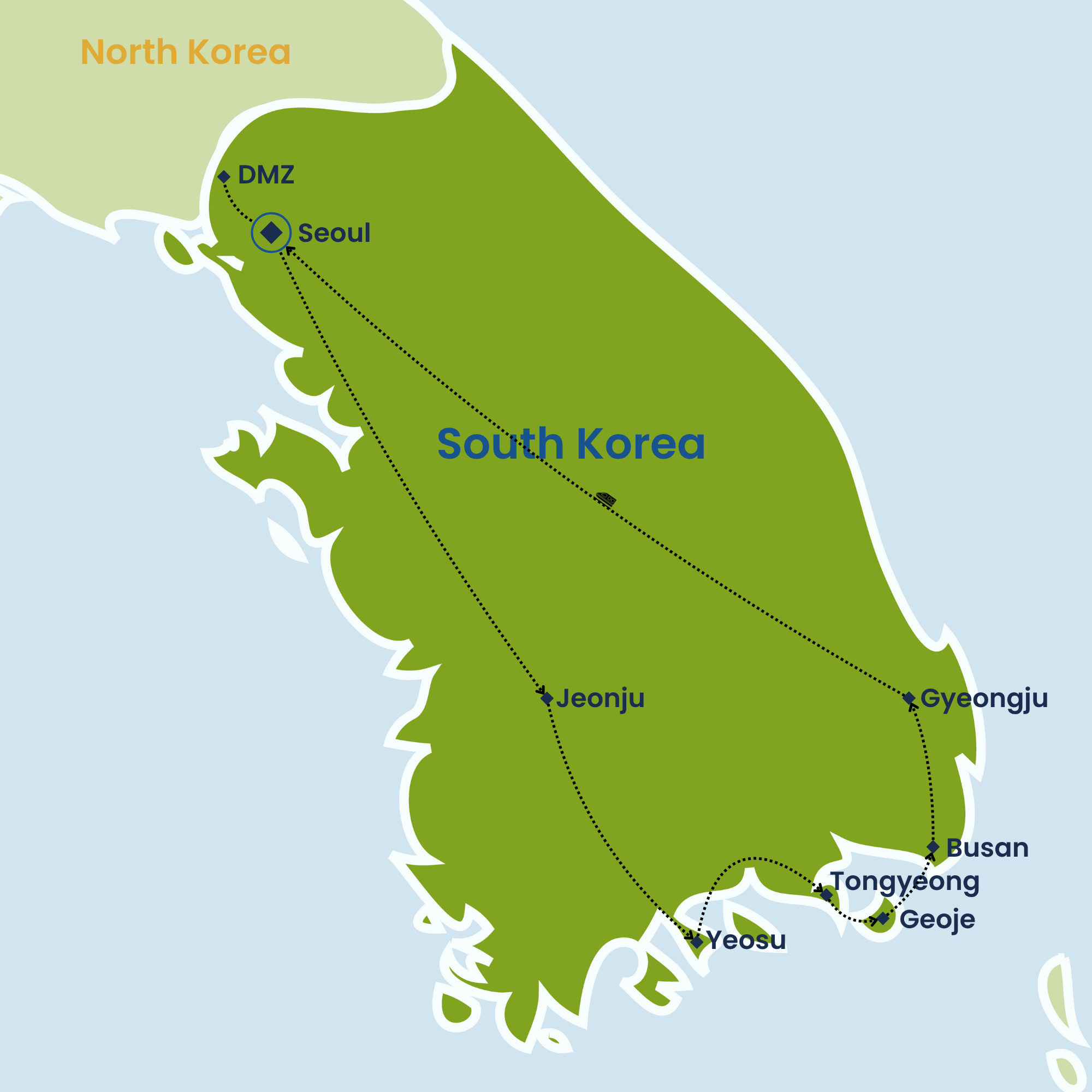 Experience the best of South Korea on this 12-day journey from vibrant Seoul to historic Gyeongju and bustling Busan. Explore Seoul’s iconic landmarks including Gyeongbokgung Palace and N Seoul Tower, then visit the poignant DMZ. Discover Jeonju’s traditional Hanok Village and Tongyeong’s coastal charm. In Busan, marvel at seaside temples and lively markets, followed by Gyeongju’s UNESCO World Heritage sites like Bulguksa Temple and Seokguram Grotto. Enjoy scenic train rides, cultural immersion, and stunning landscapes throughout. Comfortable accommodations, expert guides, and seamless transfers make this an unforgettable Korean adventure.