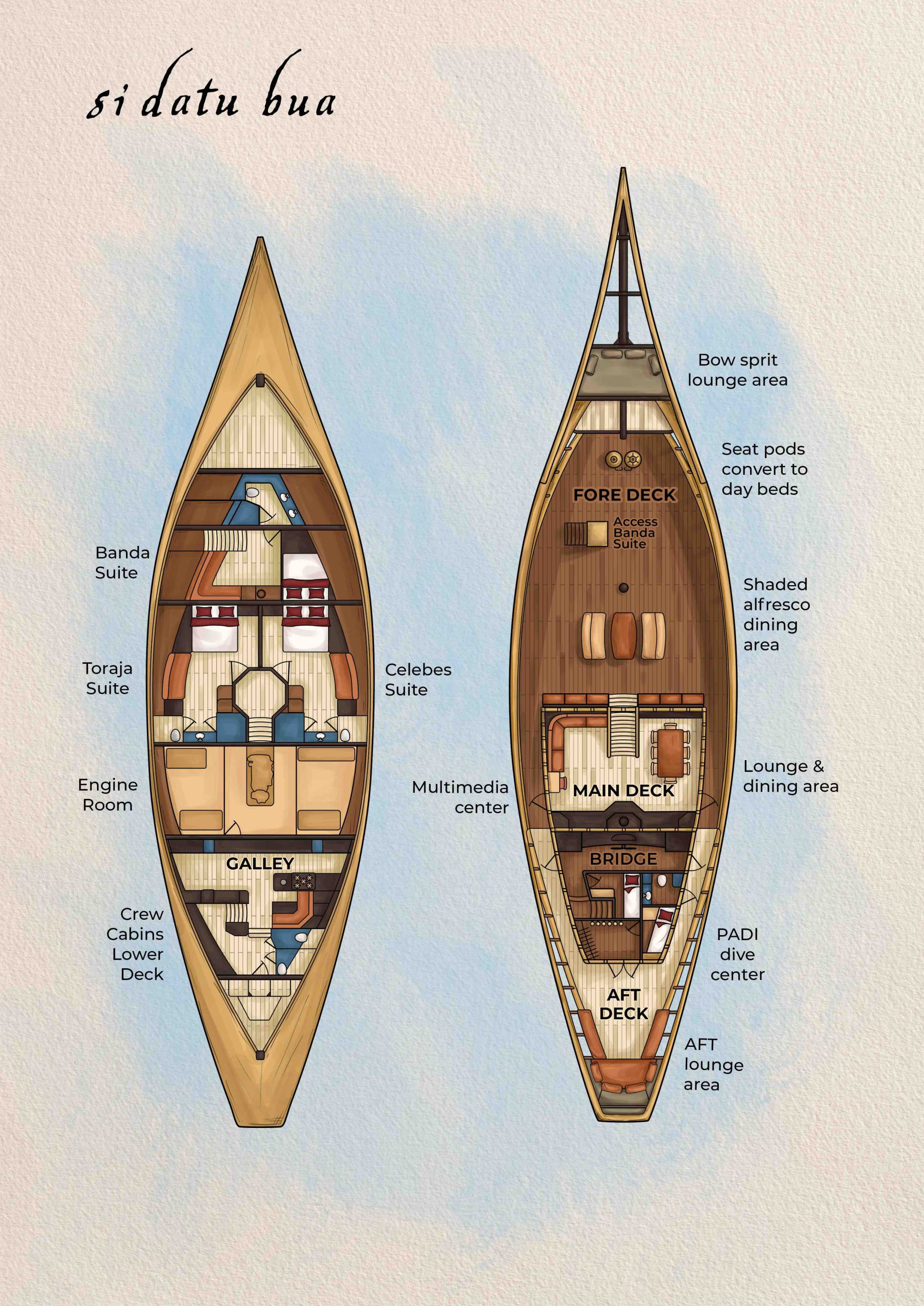 Sail into the heart of Indonesia aboard MSV Si Datu Bua, a handcrafted Phinisi yacht that captures the soul of traditional seafaring and the comfort of modern luxury. With only three beautifully appointed suites, the vessel offers an intimate and personalized voyage through some of the world’s most breathtaking waters. Expect seamless service from an expert crew, gourmet dining prepared with fresh local ingredients, and daily adventures—diving, snorkeling, kayaking, or exploring hidden beaches. Whether watching the sunrise over remote islands or dining beneath a canopy of stars, Si Datu Bua invites you to experience the ocean in pure tranquility and style.