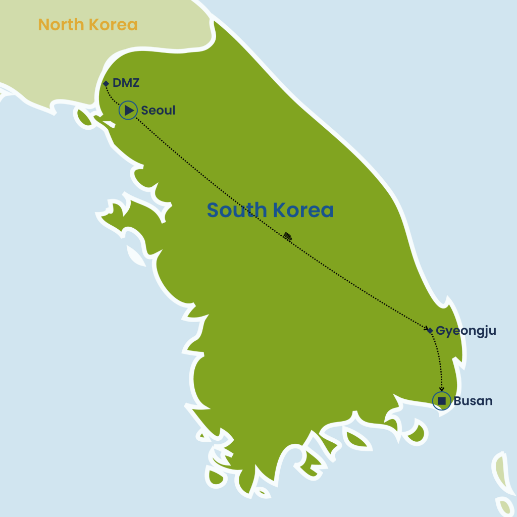 This immersive 8-day journey through South Korea begins in Seoul, where vibrant Myeongdong, the regal Gyeongbokgung Palace, Bukchon Hanok Village, and N Seoul Tower blend tradition with modern city life. A day trip to the DMZ reveals the divided Korean history, while Gwangjang Market offers local flavors. Travel by KTX to Gyeongju, the ancient Silla capital, to explore Bulguksa Temple, Seokguram Grotto, and royal tombs. Then head to Busan, Korea’s dynamic port city, to visit coastal Haedong Yonggungsa Temple, bustling Jagalchi Fish Market, and the UN Memorial Cemetery. Optional extensions to Jeju Island or Japan offer additional cultural and scenic experiences.